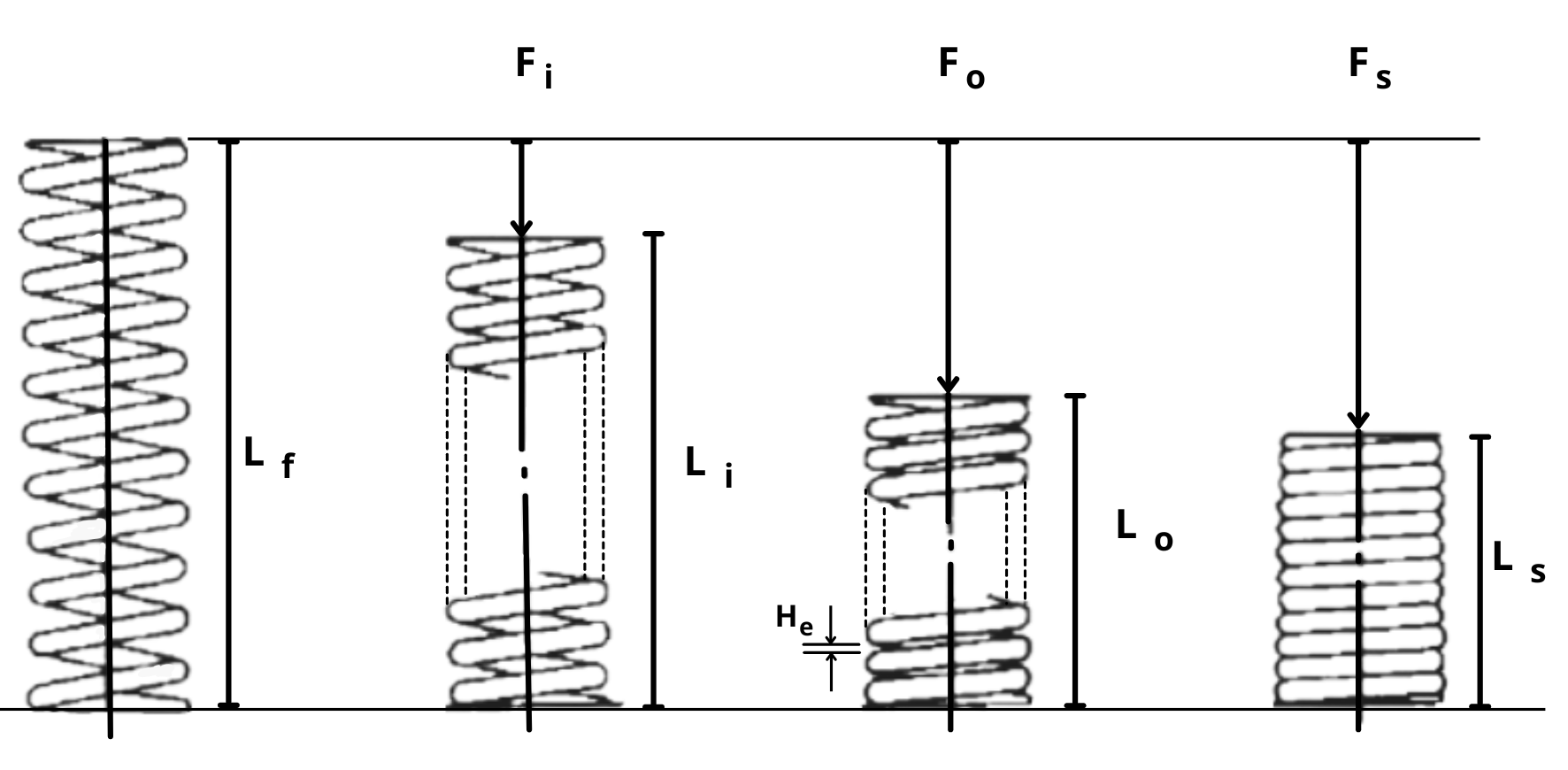 Longitud instalada (Li): Hay veces que un resorte trabaja entre 2 límites de deflexión, es decir, que trabaja entre la Longitud de operación (Lo) y Longitud libre (Lf), este estado se le denomina Longitud instalada.