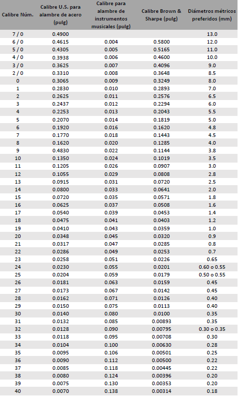La importancia de la especificación del diámetro del alambre necesario es de gran importancia a la hora de diseñar un resorte. Para ello se utilizan distintas clases de materiales en los alambres para resorte, de igual manera el alambre se fabrica en medidas estándar que abarcan un rango muy amplio. En la siguiente tabla se muestran los calibres más comúnmente utilizados: