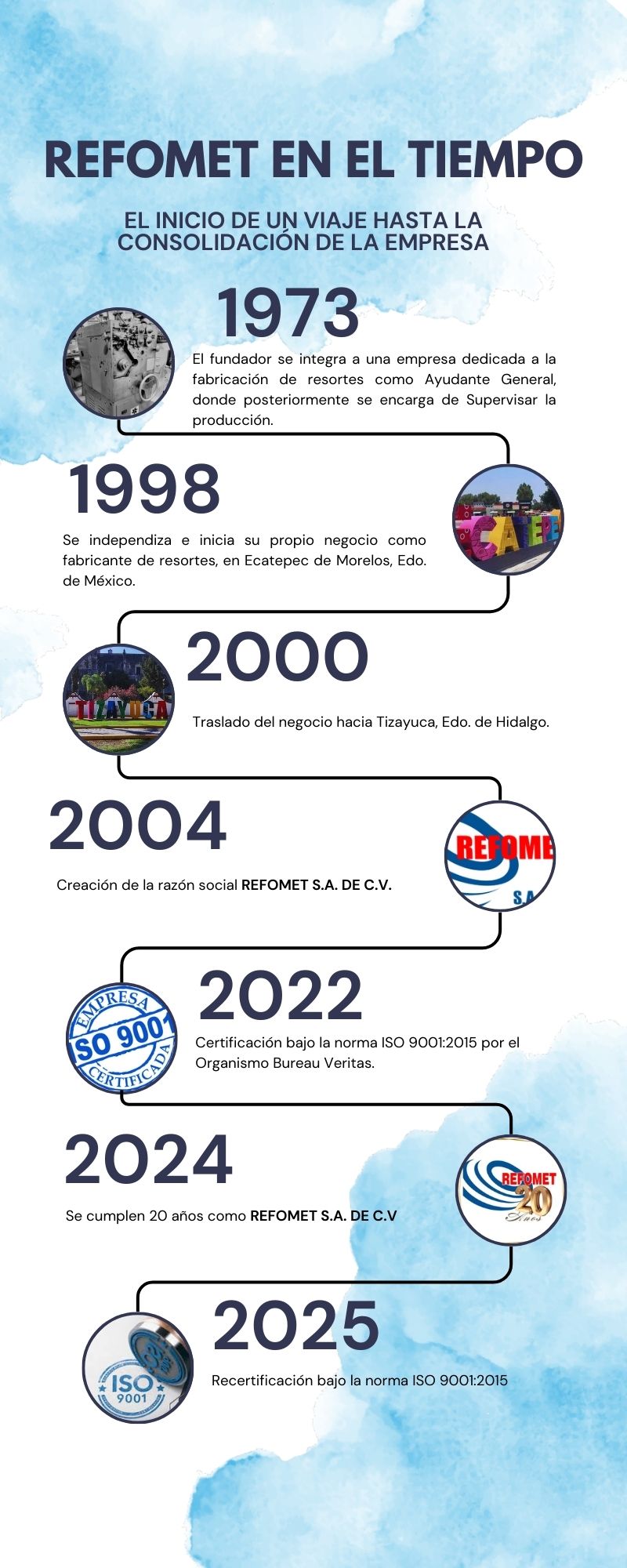 Somos una Pyme del giro metalmecánico, dedicada a la fabricación de resortes de compresión, tensión, torsión y diversas formas de alambre, contamos con más de 25 años de experiencia brindando productos de calidad, proveemos resortes para cualquier tipo de industria, especialmente para el sector de la industria automotriz. Somos afortunados por contar con la confianza de nuestros clientes y proveedores, mencionando con toda seguridad, que tenemos una buena infraestructura tanto Humana como Material que nos respalda.